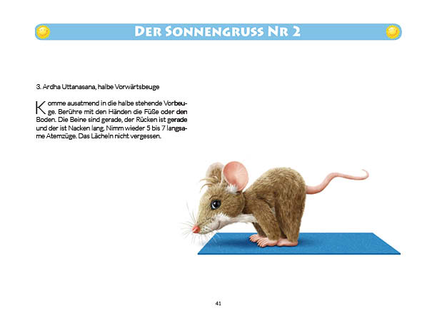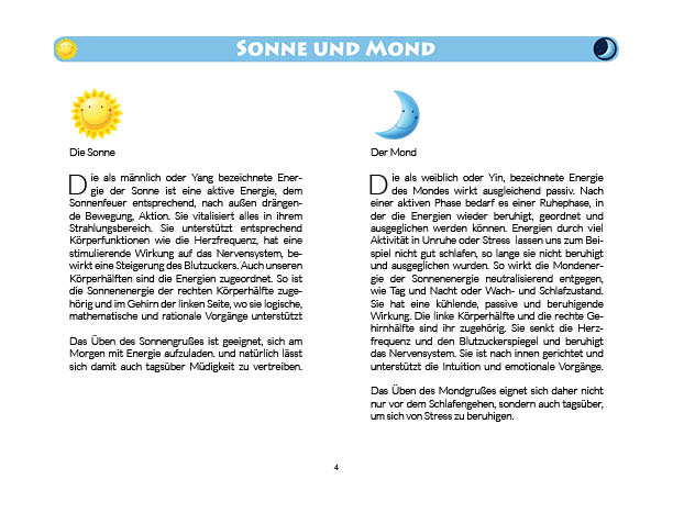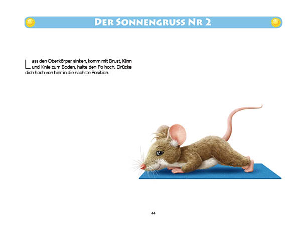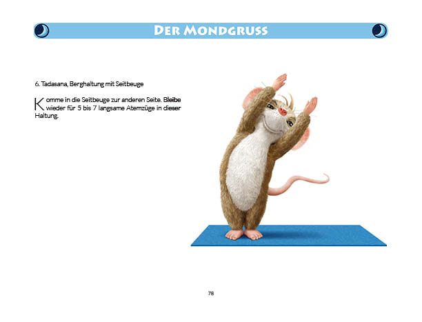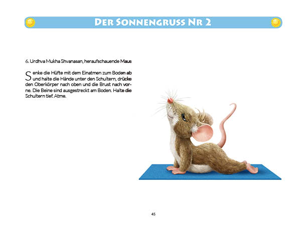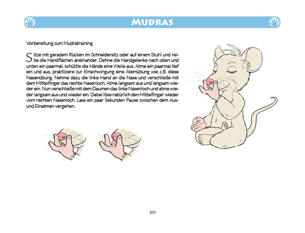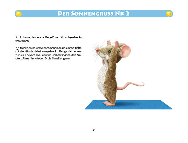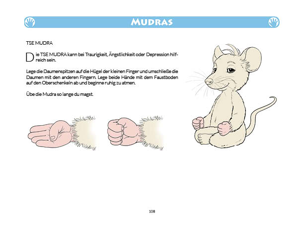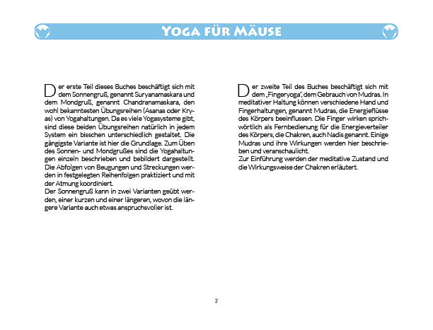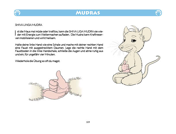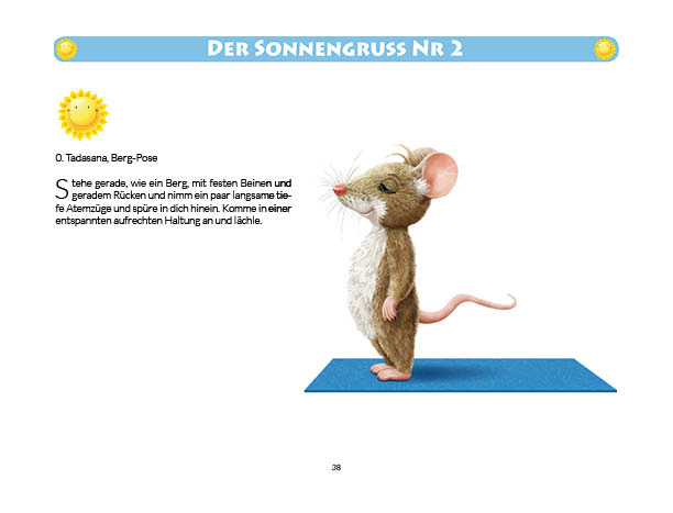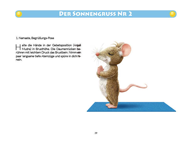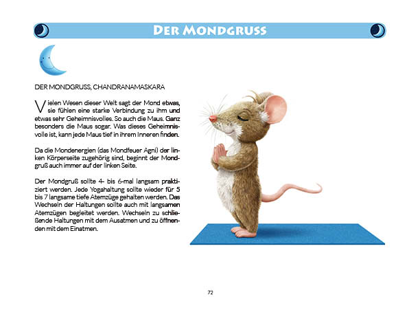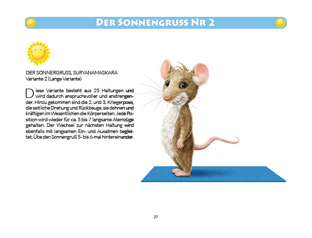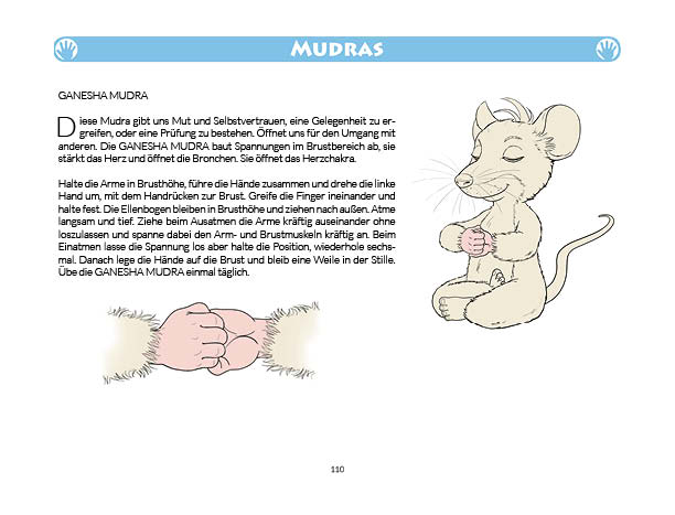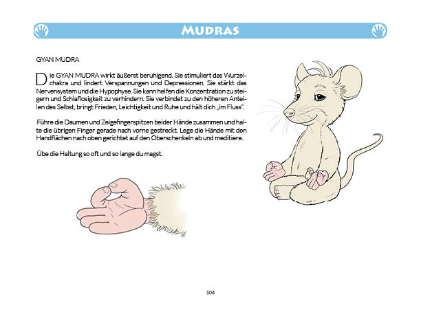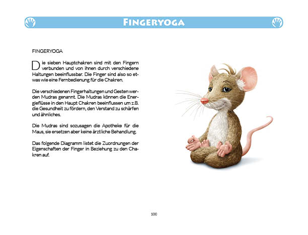 Sonnen- und Mondgruß werden in diesem Buch erklärt und mit Anwendungsbeispielen zum Üben gezeigt. Ebenso wird das Fingeryoga, die Verwendung von Mudras, mit vielen Praxisbeispielen erklärt. Ebenfalls enthalten sind die Veranschaulichung der Wirkung von Chakren und Erklärungen zur Meditation. Zielgruppe: Kinder ab 10, Jugendliche, Mäuse allen Alters