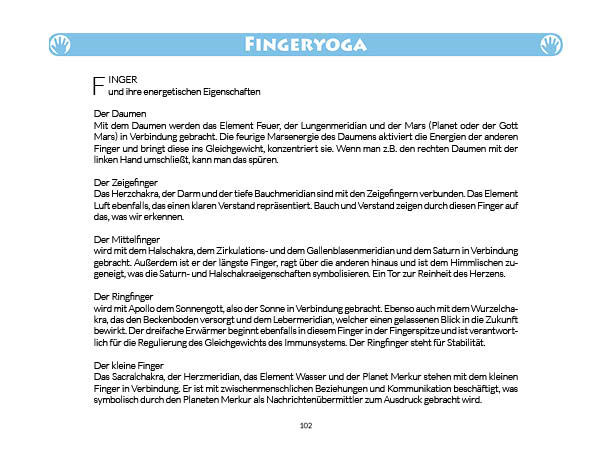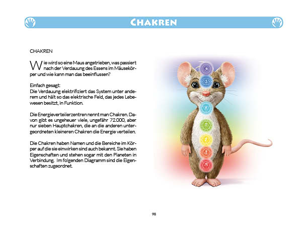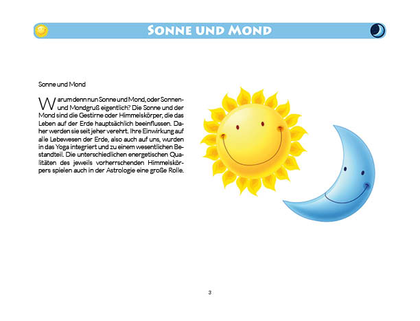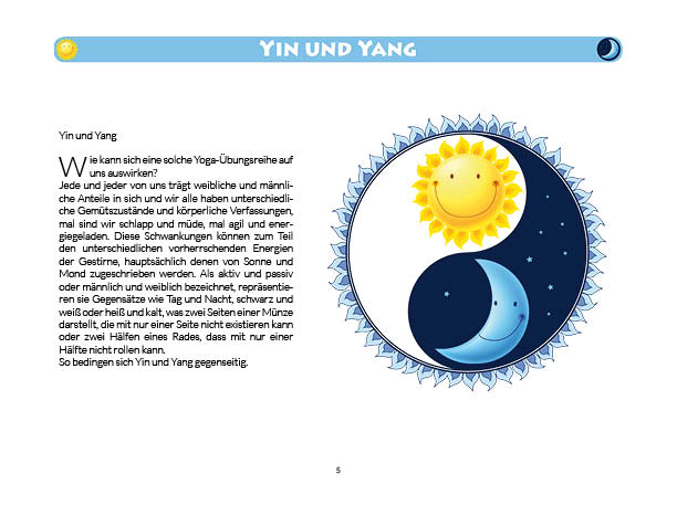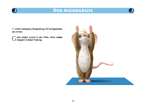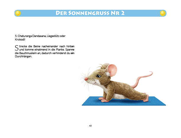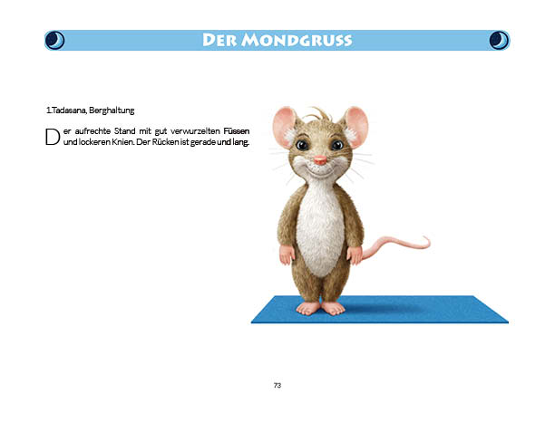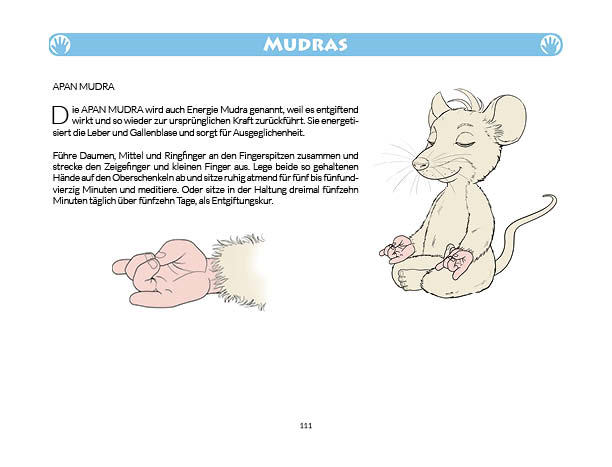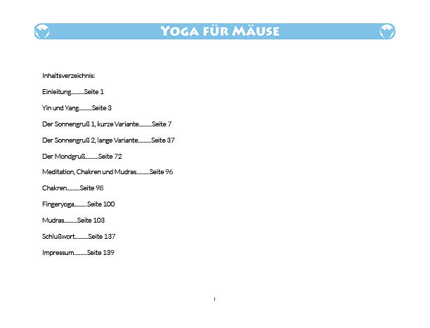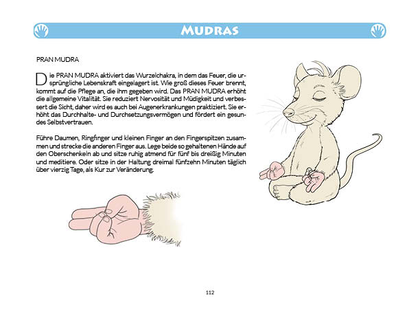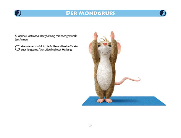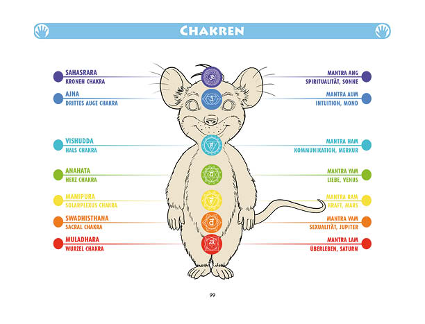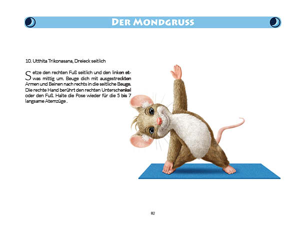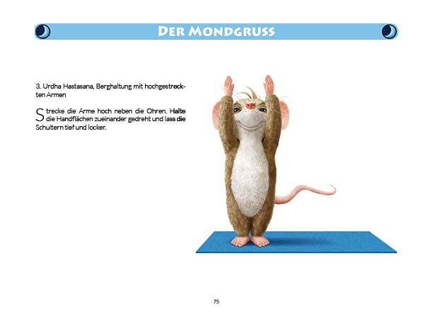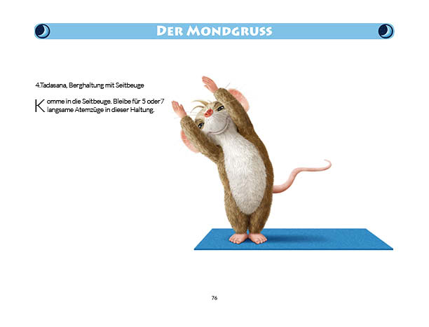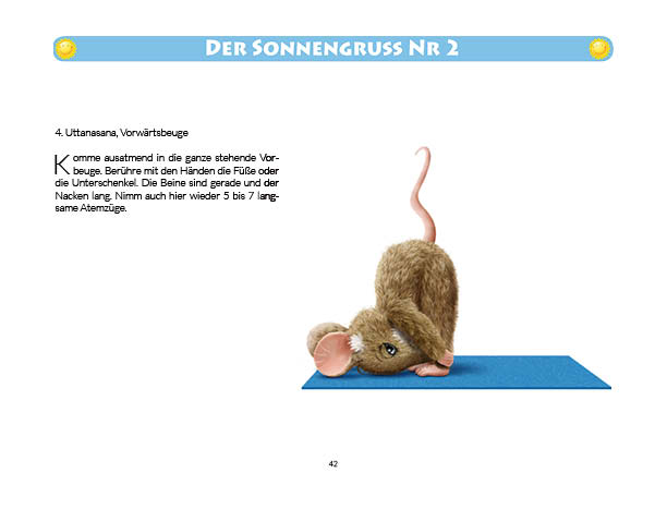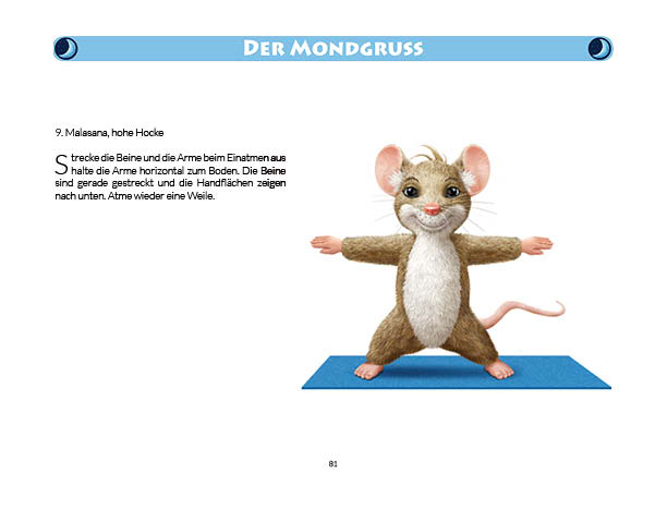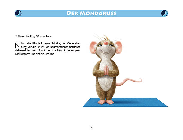Sonnen- und Mondgruß werden in diesem Buch erklärt und mit Anwendungsbeispielen zum Üben gezeigt. Ebenso wird das Fingeryoga, die Verwendung von Mudras, mit vielen Praxisbeispielen erklärt. Ebenfalls enthalten sind die Veranschaulichung der Wirkung von Chakren und Erklärungen zur Meditation. Zielgruppe: Kinder ab 10, Jugendliche, Mäuse allen Alters
